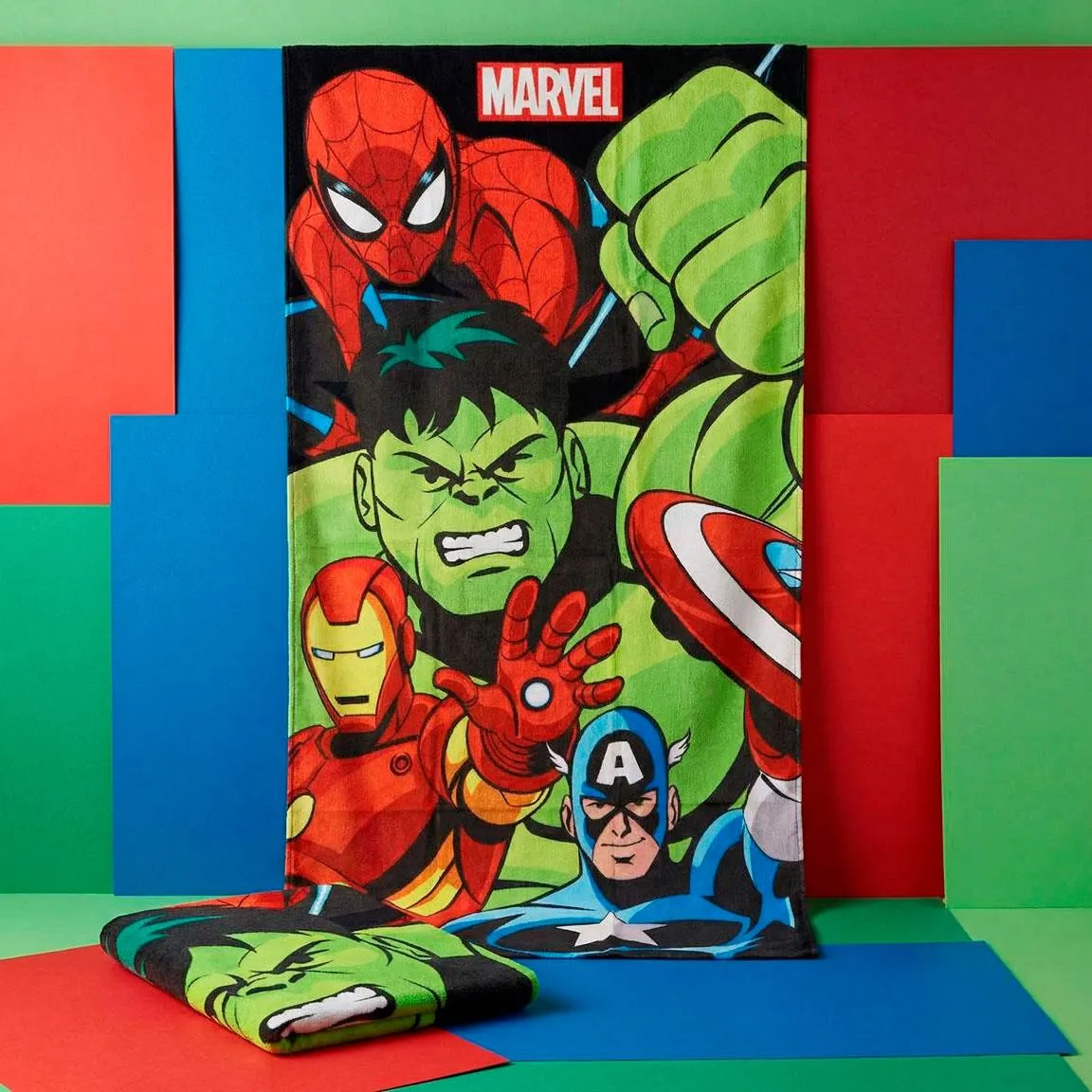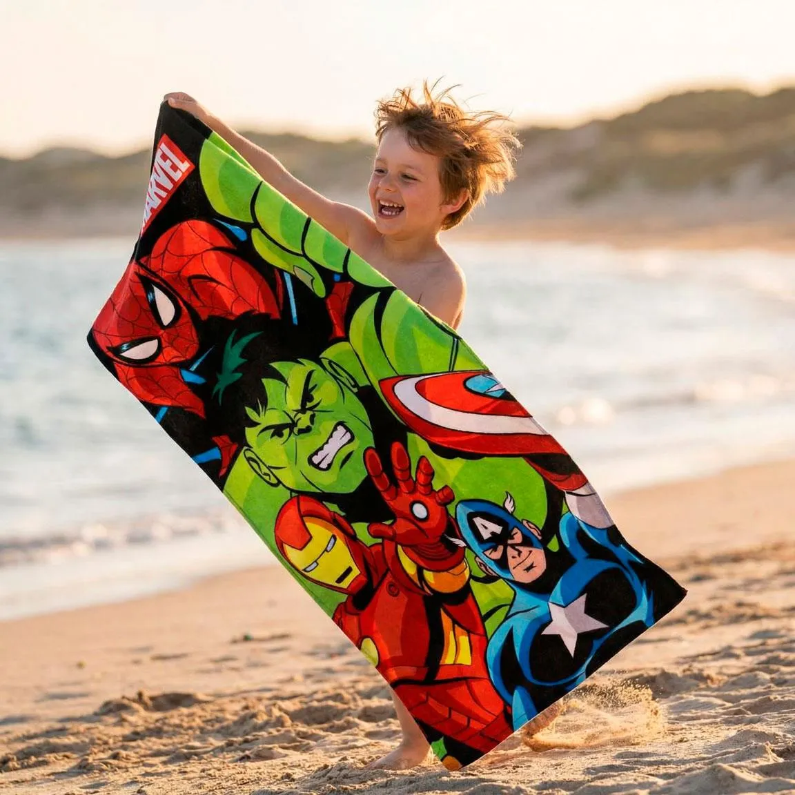 Cool Marvel Avengers beach towel for kids featuring Hulk, Spiderman and Iron Man. Perfect for the beach, pool or holidays. Made from soft and quick-drying material, ideal for everyday use by real superhero fans. Read more