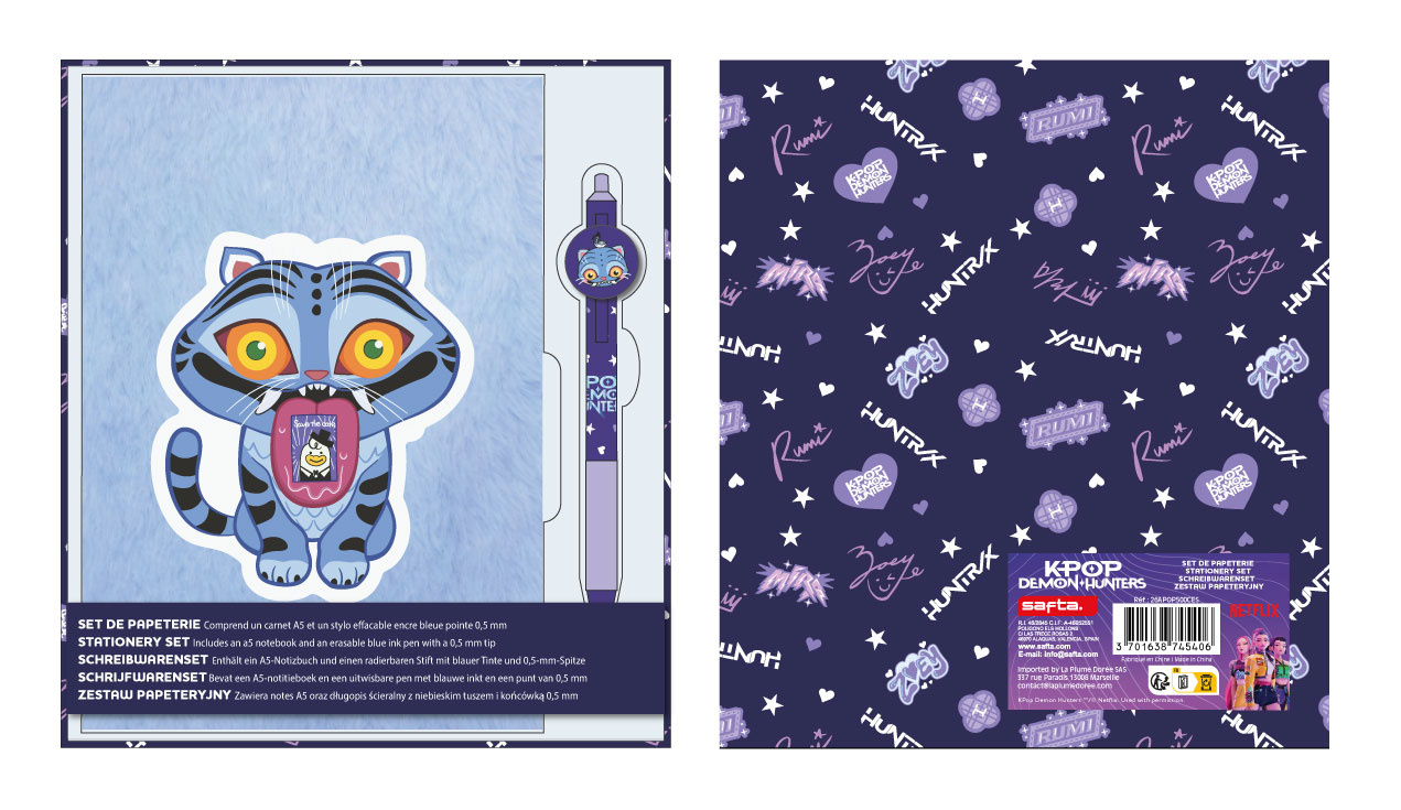 Maak schrijven extra leuk met deze Kpop Demon Hunters Derpy schrijfset. Deze officiële set bevat een stijlvol A5 notitieboek met zachte pluche uitstraling en een uitwisbare blauwe pen (0.5 mm) in bijpassend design.